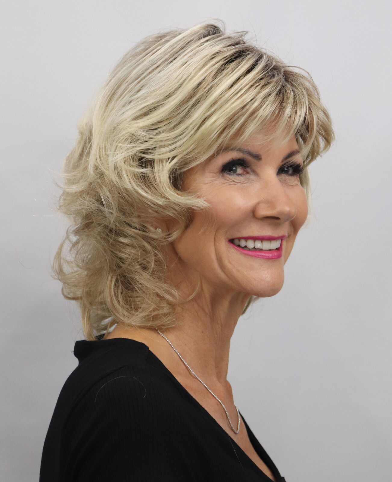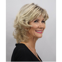 Bonnie's artful layers just skim the shoulders for those who want a little length and gentle all over wispiness. The fringe can be worn light and wispy or side swept for a little drama. Tuck a little behind the ears or fluff all over for more volume. You can even clip up one side or both for a really elegant look. Bonnie has enough length and soft movement for an amazing amount of styling versatility. Fringe: 4", Sides: 5.5", Crown: 6", Nape 7".
