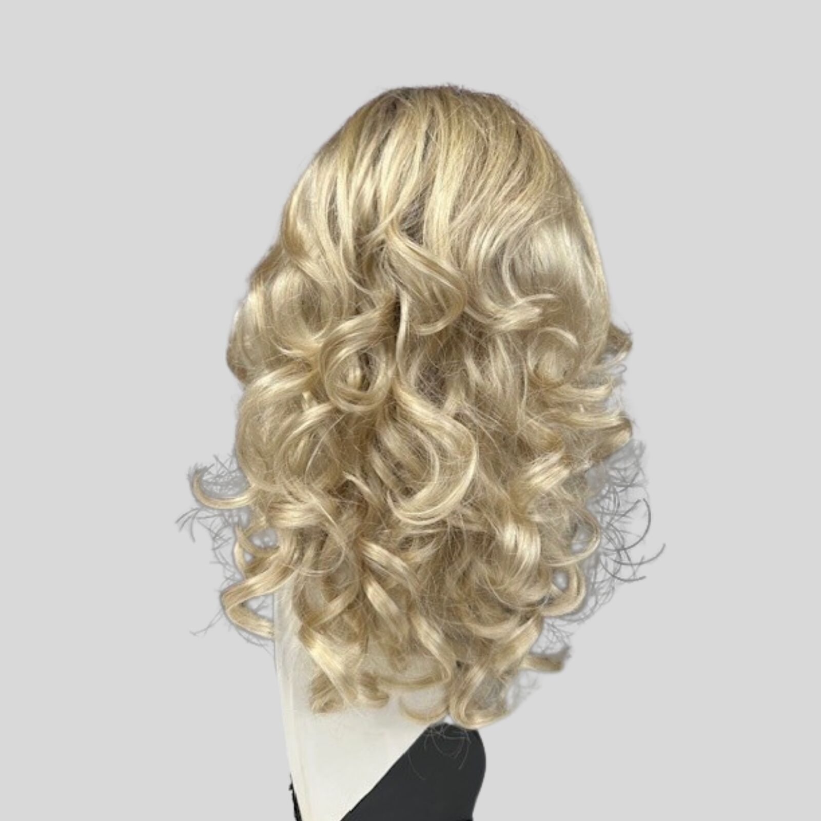 Lace Front with an invisible hairline as well as hand tied Mono Top for the most realistic appearance and flexible parting, this long wavey style cascades beautifully at the sides and back. The long side swept fringe frame the face for an ultra feminine look. She has enough length to pull back into a low pony or clip and the gorgeous blend of light blondes with soft roots enhance the curls.