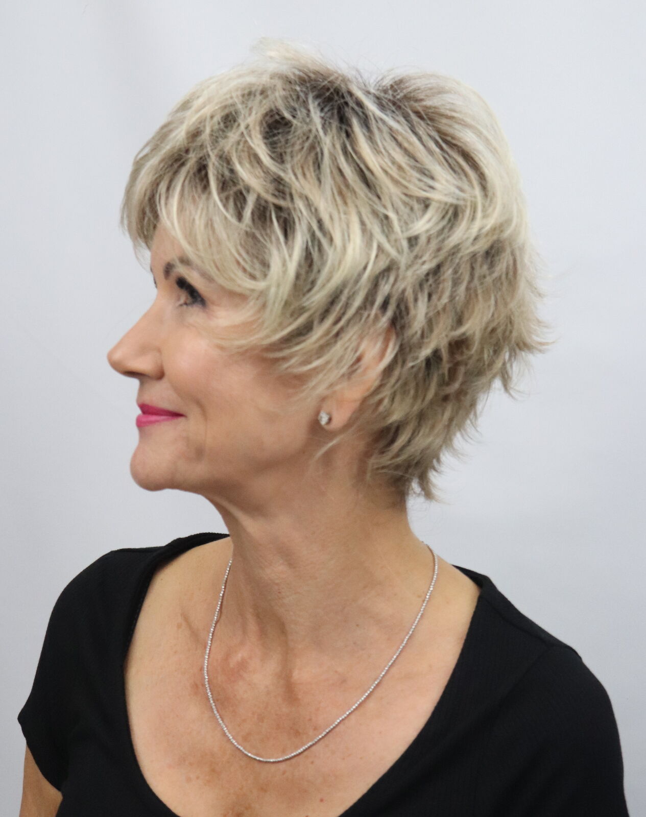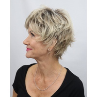This is a great style and one of our best sellers but the photos nor description do it justice. The perfectly cut layers create a light and wispy front that flow into a short and flicky back that is a great "today" look and we see it work so well on so many. She is a very light and casually elegant style........with style! A nice change from the typical short layered cut with a tapered nape and a great look that can take you anywhere at a moment's notice. Fringe: 3.5", Sides: 3.75", Crown, 3.5", Nape: 2".