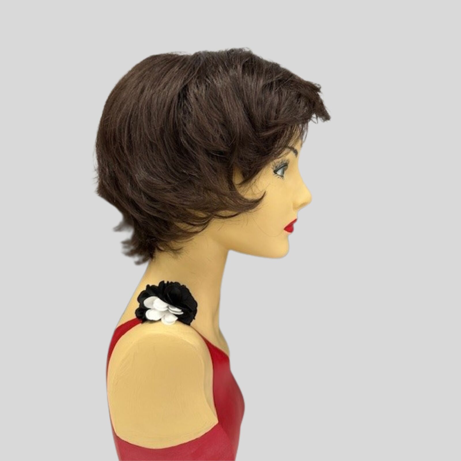 Petite cap sizing and a great layered short cut that has a fun and flicky back with wonderful soft volume. The long layered side swept fringe can be trimmed to suit and the Dark Chocolate colour is perfect for most skin tones.