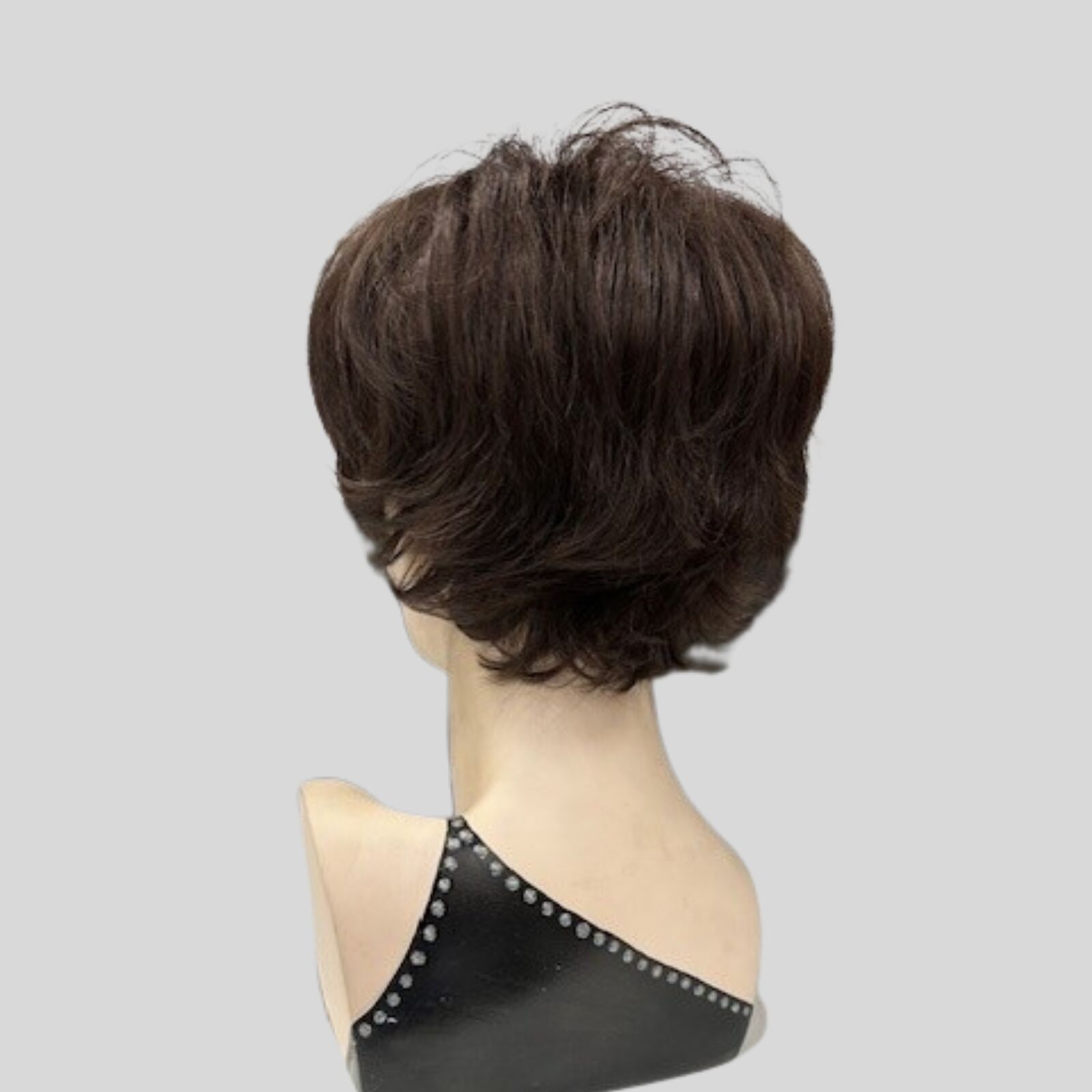 Petite Kaelyn Short Layered Back and Wispy Long Fringe Dark Brown Wig