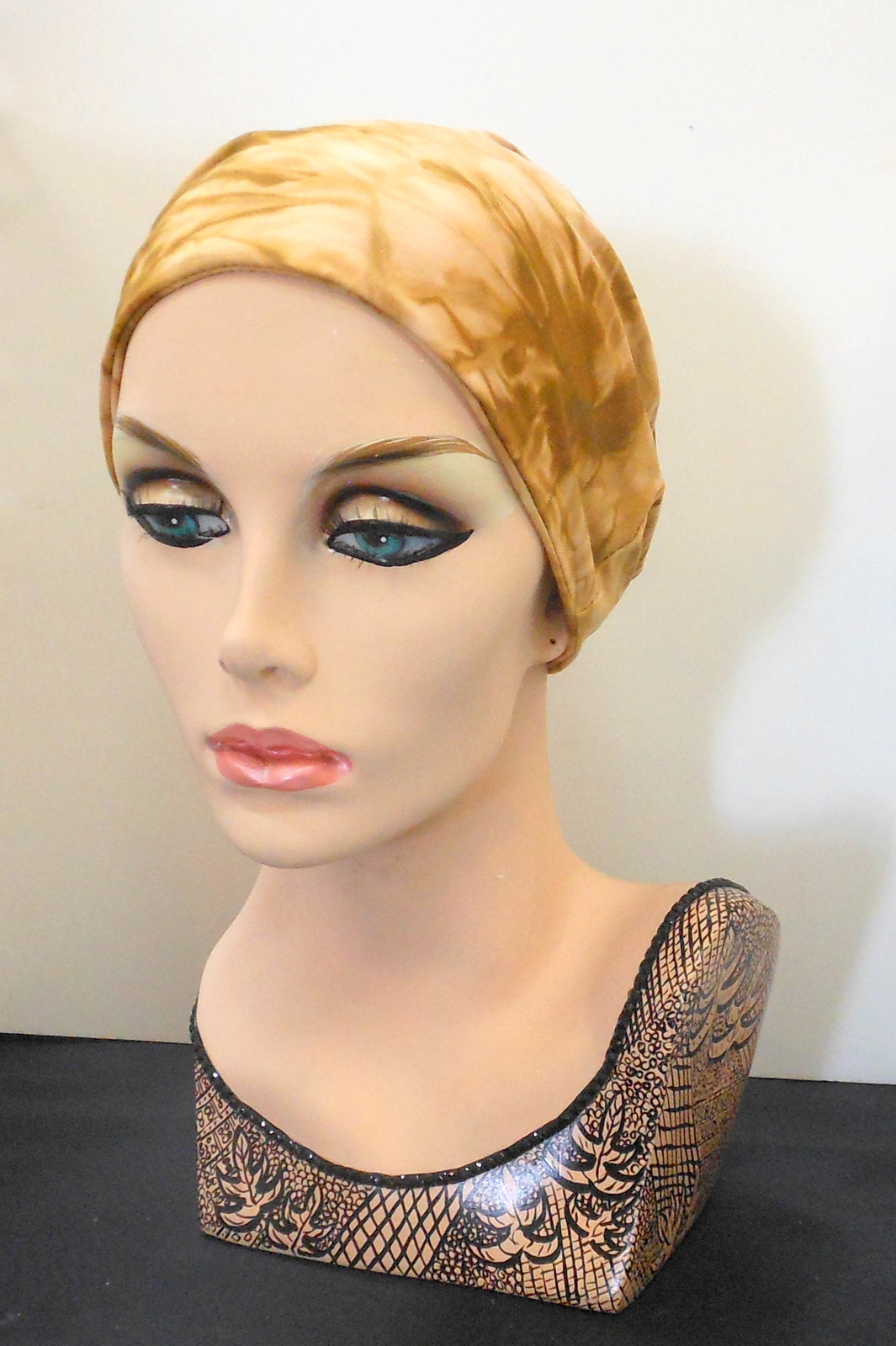 A soft tie dye pattern in shades of gold make this beautifully soft turban a great accessory to wear with almost anything. Neutral enough to wear with plain colours, jeans or casual wear for a bit of whimsy. With the soft pattern and colours this is a wear with anything beannie style turban and the golden tones are especially flattering to most skin tones.
